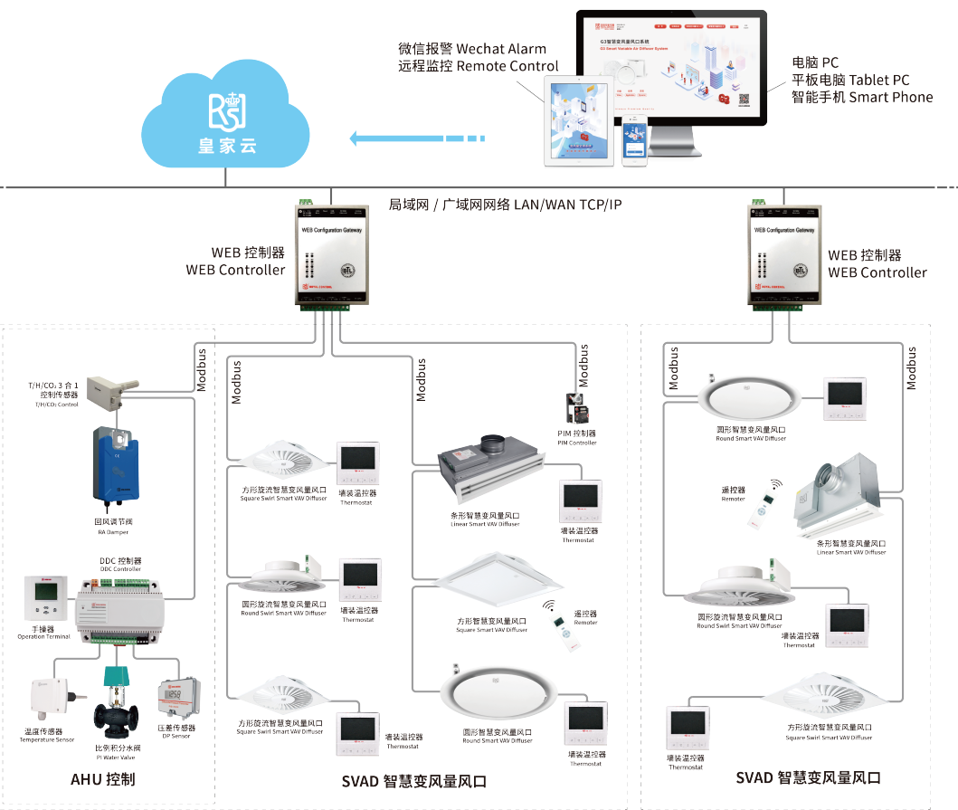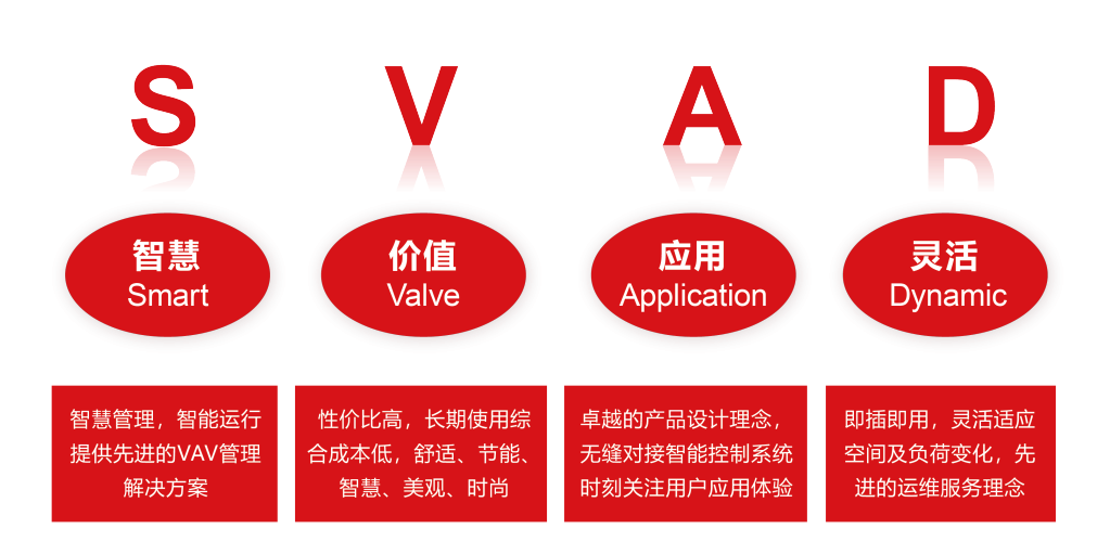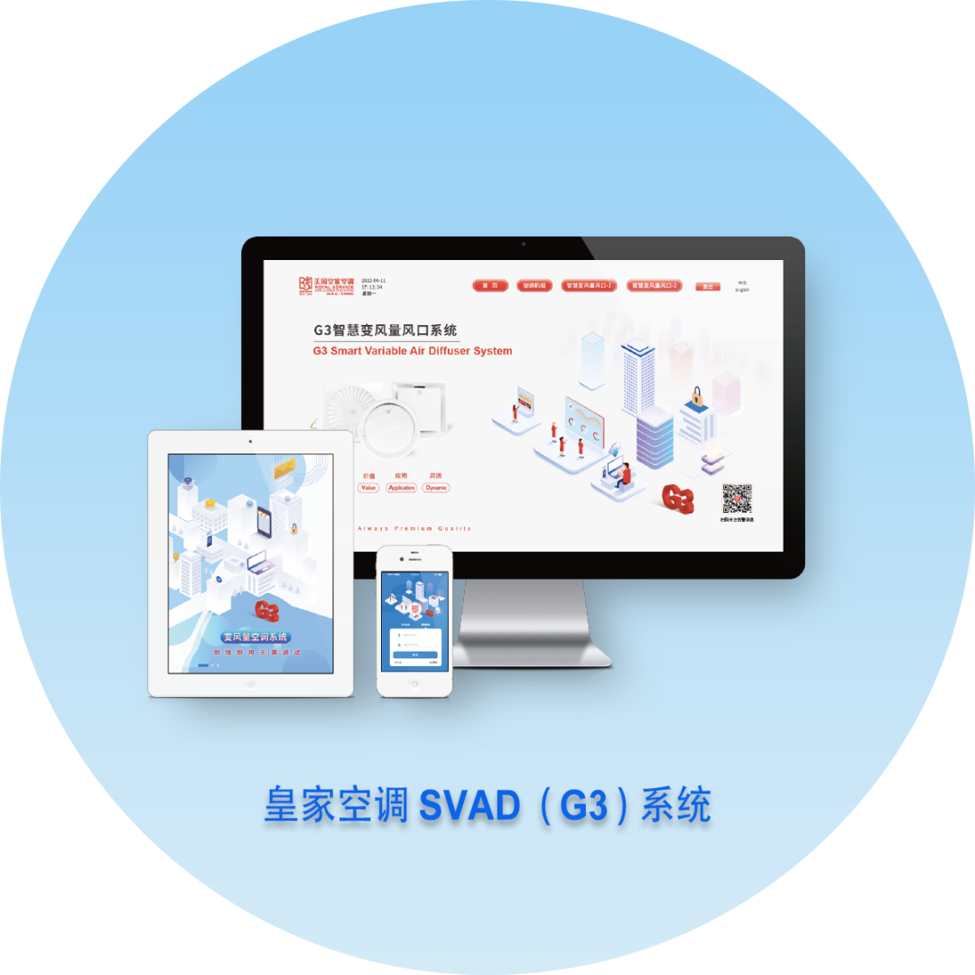 皇家空调SVAD系统集成应用方案是专为变风量空调系统定制的方案,该方案将所有设备进行标准化、模块化设计,包括但不限于系统操作界面及软件、DDC控制箱及软件、强电控制箱、AHU、智慧变风量风口、系统温度、湿度、压力传感器等设备。