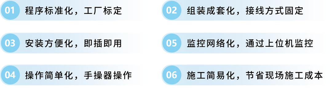 所有模块设备的软、硬件均在工厂完成安装并测试合格,以成套形式发货项目工地,现场只需按照系统架构图示将各个模块进行连接,无需更多的测试调试工作,各模块之间均预留快速连接端口,现场根据连接端口的线码标识对号连接即可,即插即用,省时省力。
